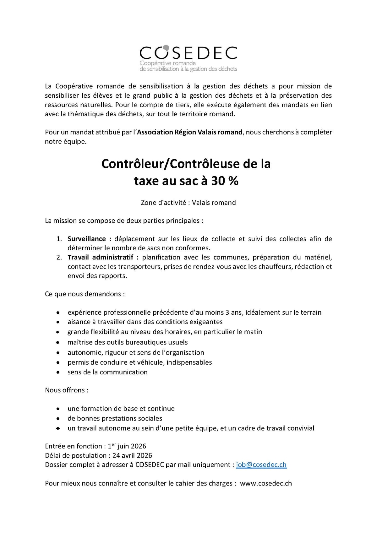 Dans le cadre de la gestion des déchets en Valais romand, nous relayons une opportunité au sein de COSEDEC : Contrôleur·se de la taxe au sac (30%). Un rôle clé pour garantir un système équitable et contribuer à une meilleure gestion de nos déchets.